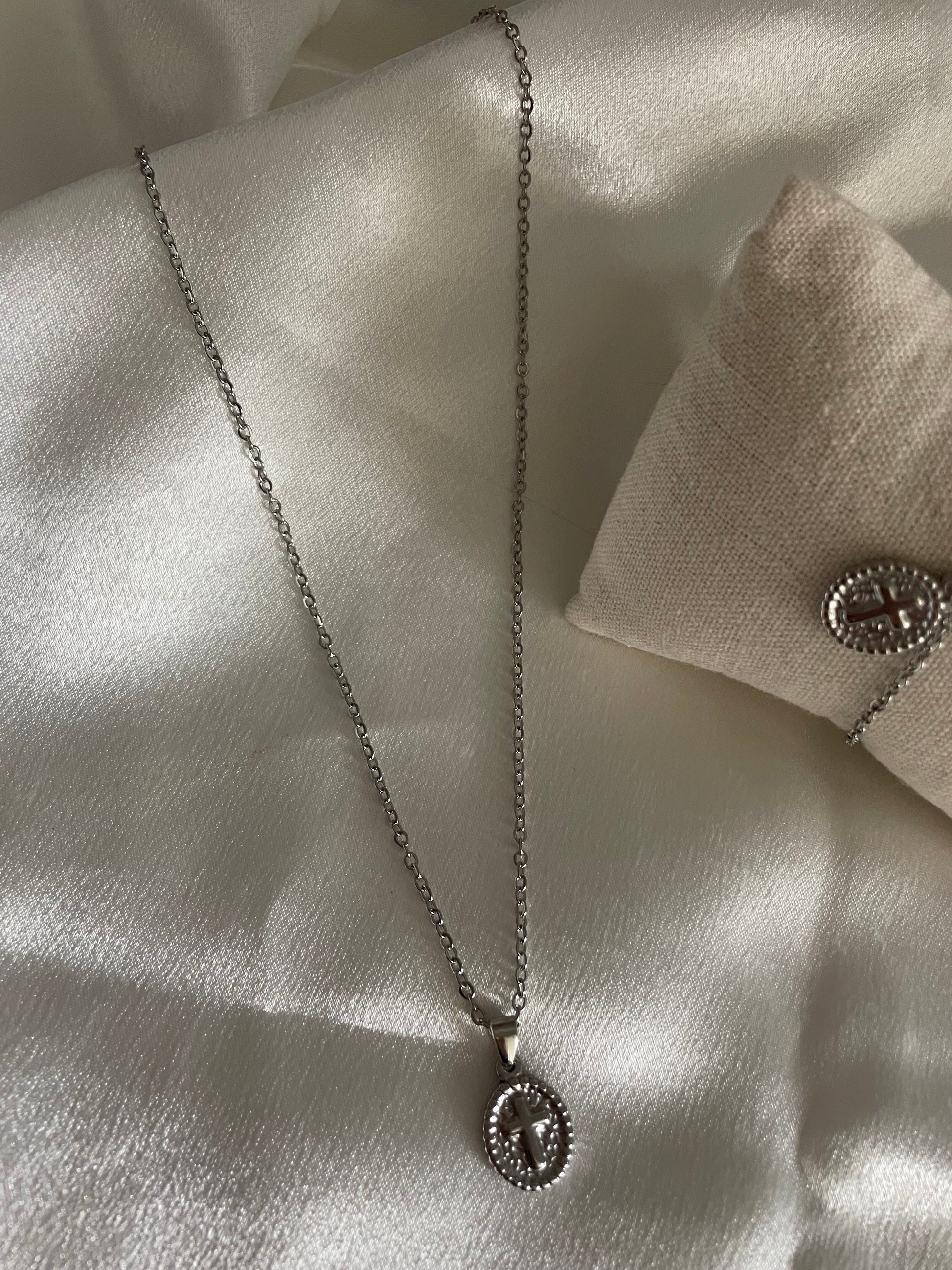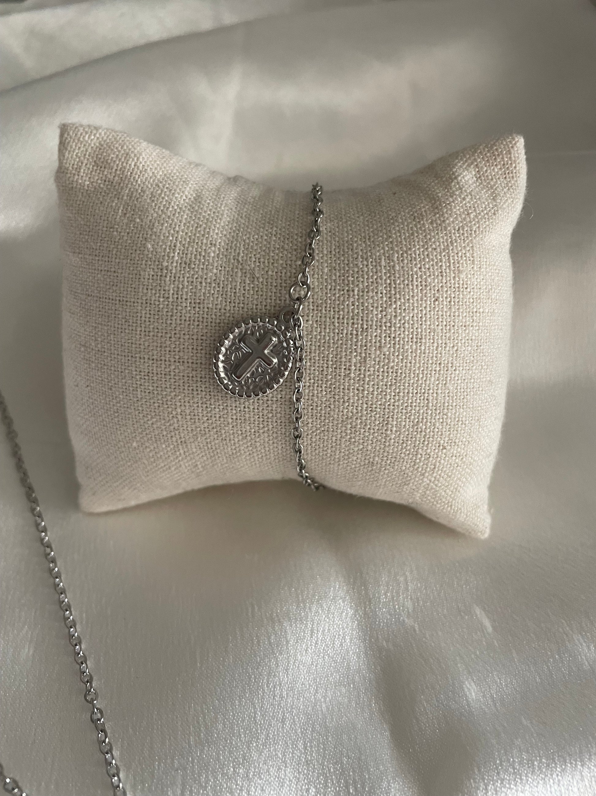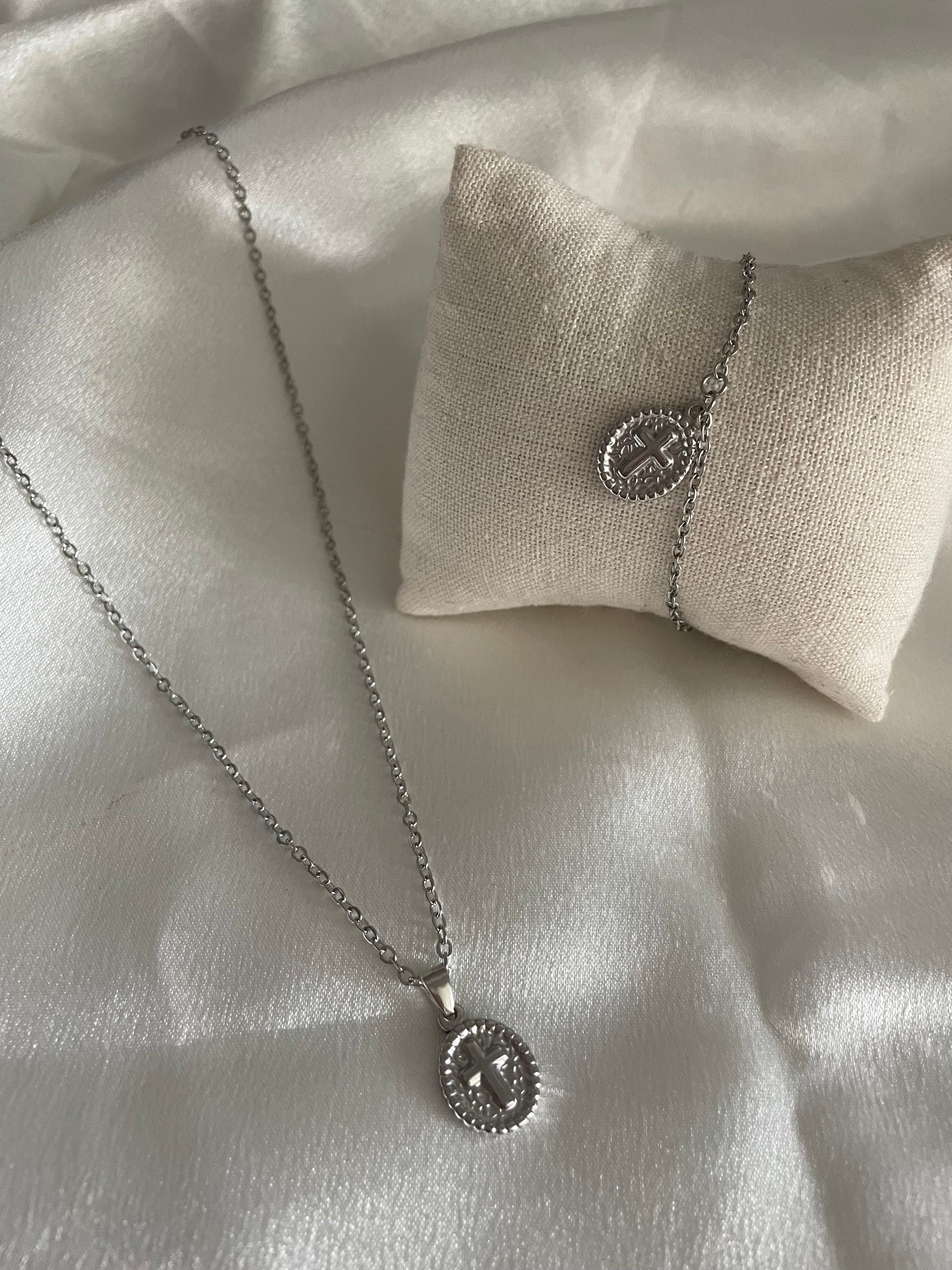 Le collier et le bracelet s’accordent parfaitement grâce à leur pendentif identique : une petite croix délicatement posée sur un fond argenté. L’acier inoxydable assure une brillance durable et une résistance au quotidien, sans jamais ternir.
