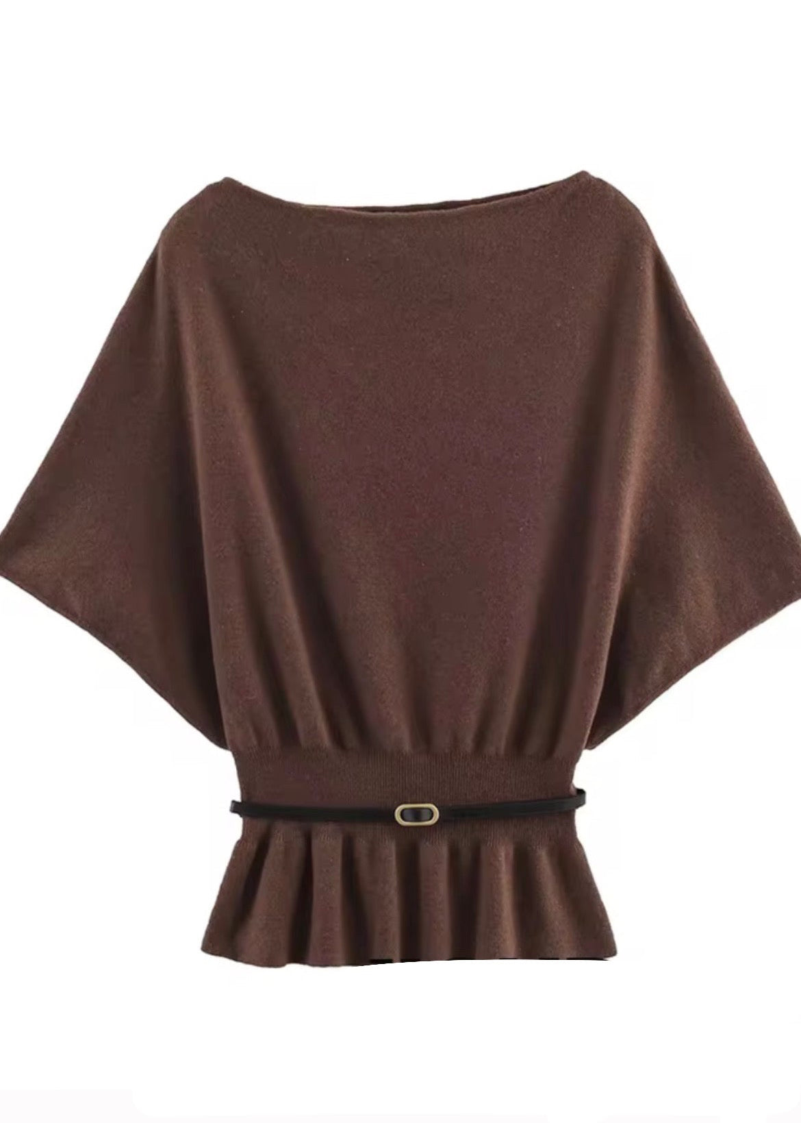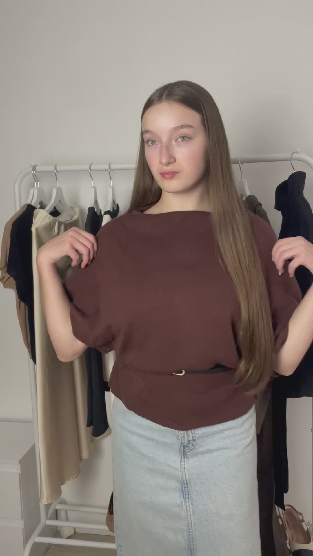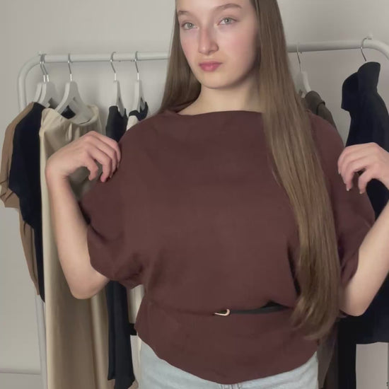 Haut marron ceinturé – Élégant et pudique, ce haut marron met en valeur les formes grâce à sa ceinture ajustable tout en restant parfaitement couvrant au niveau de la poitrine. Son tissu fluide et sa coupe soignée en font une pièce idéale pour un look chic et confortable. Sur la vidéo, la mannequin porte une taille M.