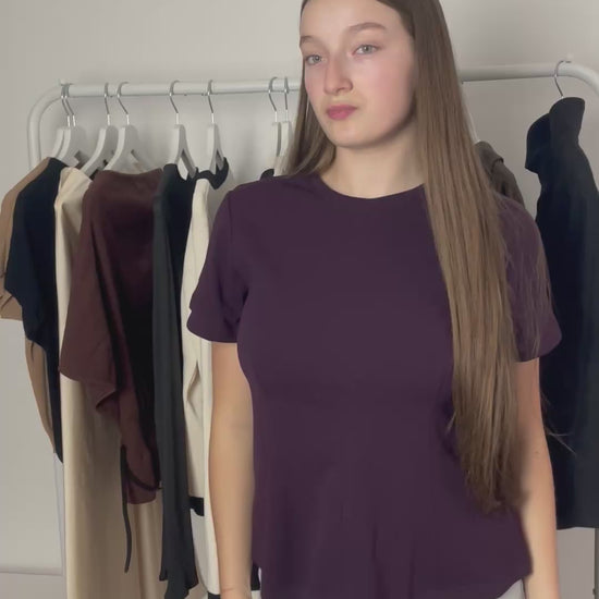 Haut péplum violet – Féminin et raffiné, ce haut violet séduit par sa coupe péplum qui marque joliment la taille. Son tissu fluide et sa teinte vibrante en font une pièce parfaite pour apporter de la couleur à vos tenues. Sur la vidéo bleue, la mannequin porte une taille M.